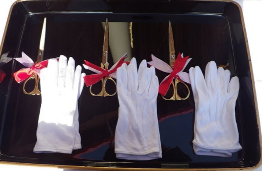 紅白テープ、テープに取り付けるテープカットリボン、金バサミ、白手袋、黒盆、紅白テープの端を結ぶ金ポール、下に敷くパンチカーペットなどが必要です。紅白テープは一人当たり1mを目安に、パンチカーペットは人数分プラス1mを目安にしてください。金バサミや白手袋は人数分、テープカットリボンは人数分に加えてポールにつける分も用意しておきましょう。