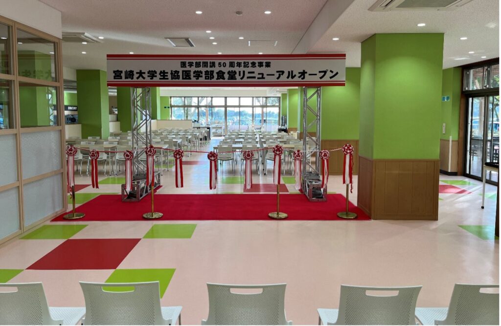 大学内の学生食堂のオープニングセレモニーで、テープカット用品をご利用いただきました。当日はトラスゲートと呼ばれる門型のフレームに横看板を取り付け、その前でテープカットを実施。新施設の門出を華やかに演出しました。