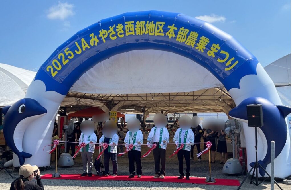 JAみやざき西都地区本部が主催する毎年恒例の農業まつりで、開会式のテープカット用品をレンタルいただきました。会場には大型テントやステージ、農機具展示コーナーなどが設けられ、地域の方々でにぎわうイベントでした。