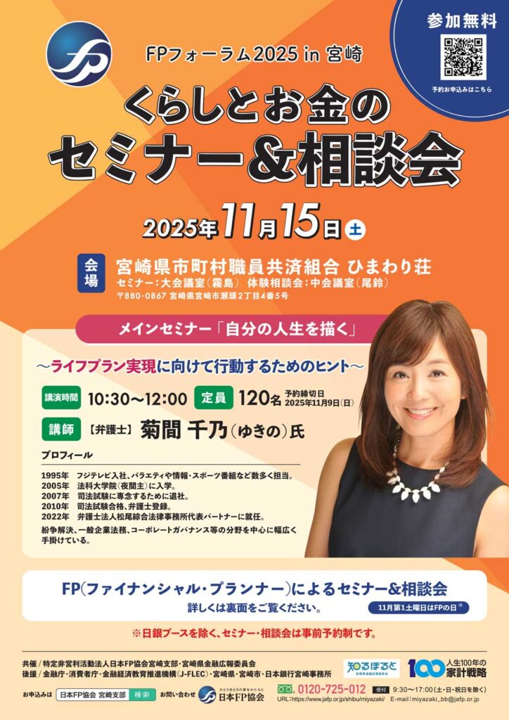 宮崎市で暮らしとお金に関する学びと相談ができるイベント「FPフォーラム2025 in 宮崎 くらしとお金のセミナー&相談会」が、2025年11月15日(土)10:30〜16:30 に開催されます。