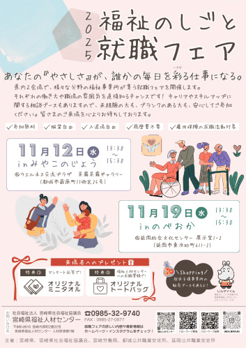 宮崎県社会福祉協議会では、県内の福祉・介護分野での就職を希望する方を対象に、「令和7年度 福祉のしごと就職フェア in 都城・延岡」を開催します。