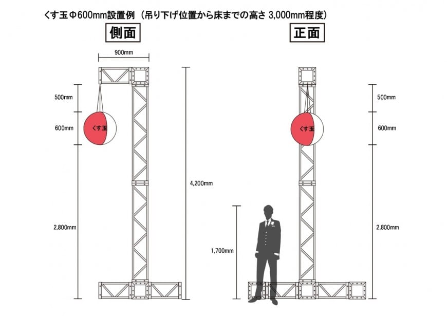 このくす玉は、手軽に設置でき、イベントの雰囲気を一変させます。くす玉専用スタンドや垂れ幕の文字入れもオプションで承っておりますので、イベントのテーマやメッセージに合わせてカスタマイズ可能です。清潔に管理されており、安心してご利用いただけます。