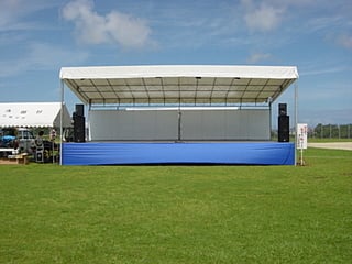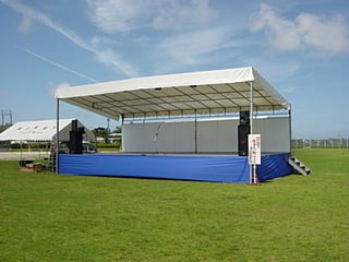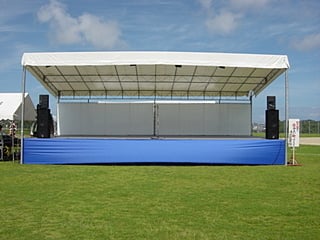 大規模な屋外イベントでのパフォーマンスや講演、式典に最適な「屋根付きステージ 3k×6k」のレンタルサービスです。屋根が付いているため、日差しや雨から出演者や機材を守り、天候に左右されずにイベントを進行できます。